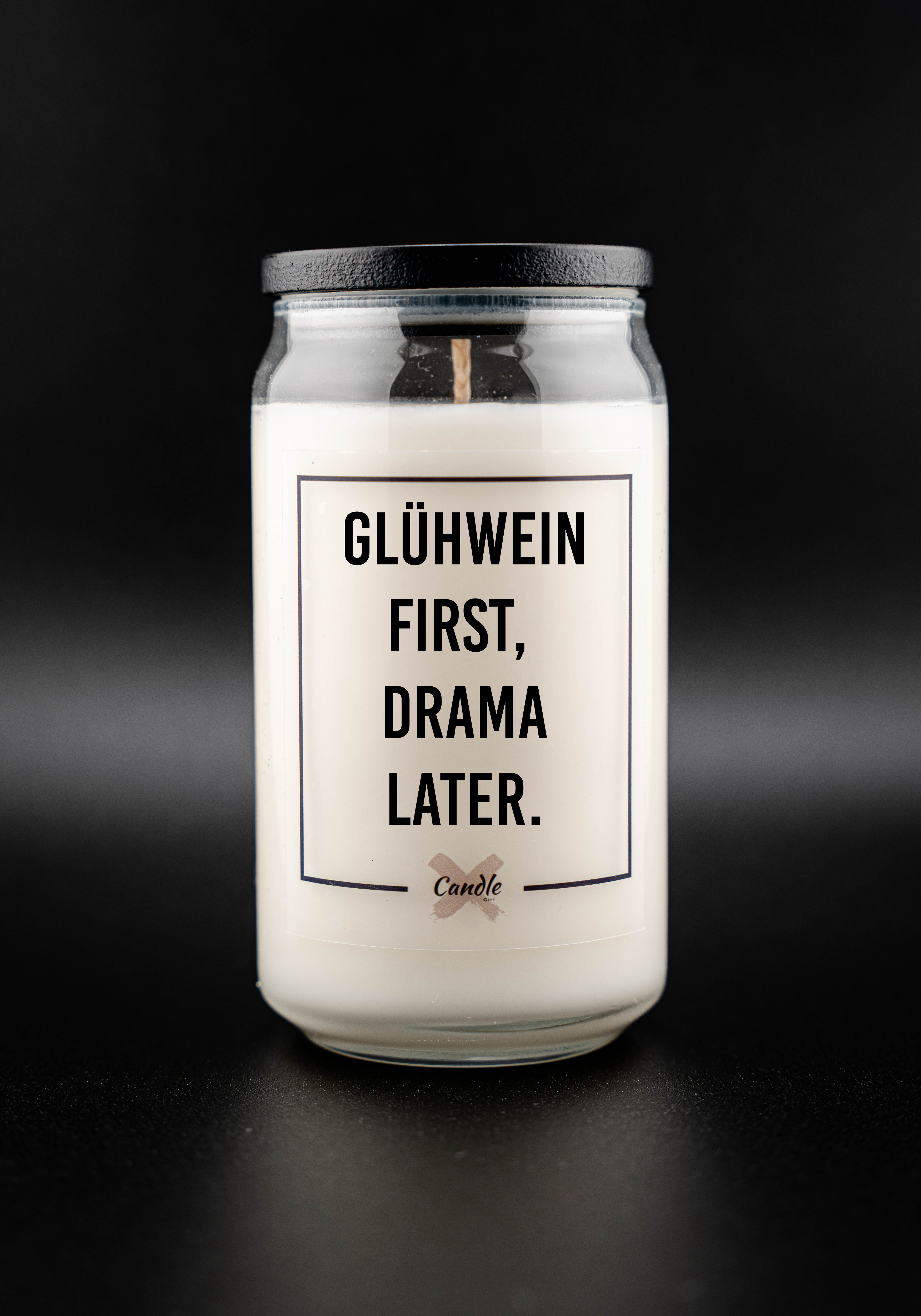 Kerze mit Spruch | GLÜHWEIN FIRST, DRAMA LATER